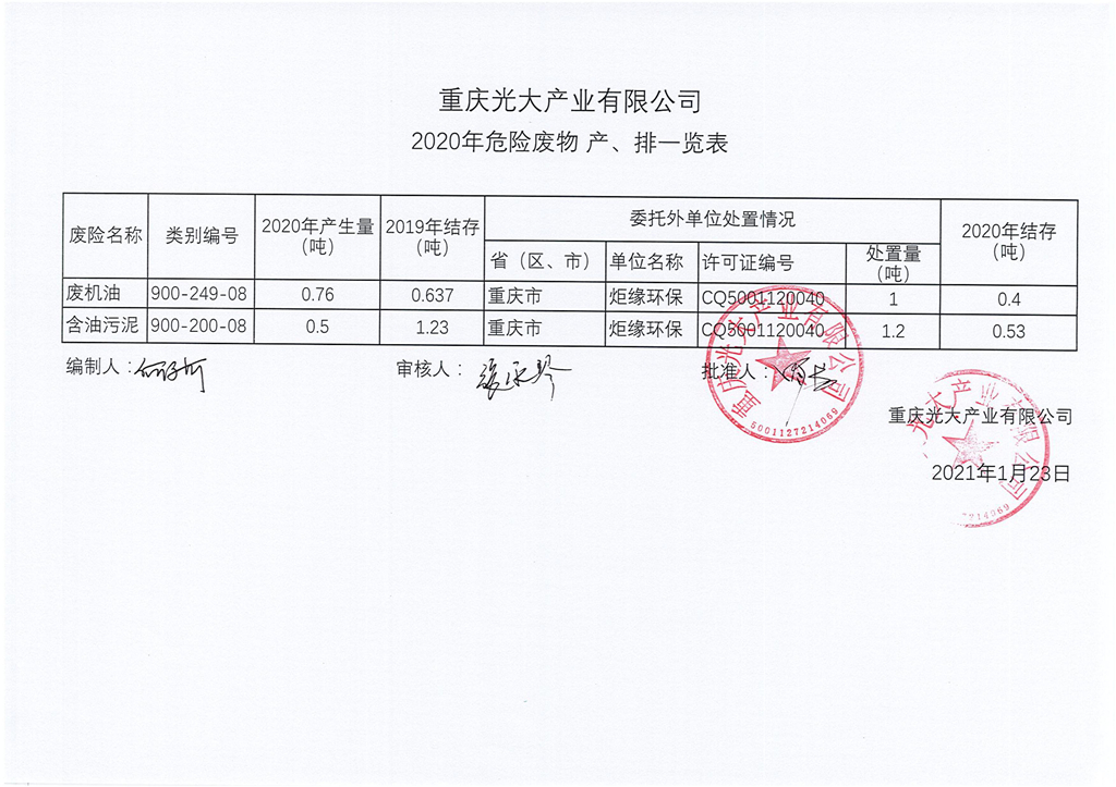 重慶光大産業有限公司2020危險廢物産、排一覽表公示